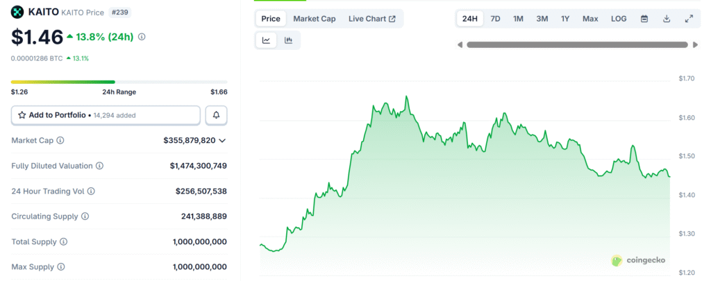 In fact, the KAITO token price has actually risen 14.36% in the past 24 hours to $1.46, 41.62% over the last week, and has a market capitalization of $355.8 million with trading volume.