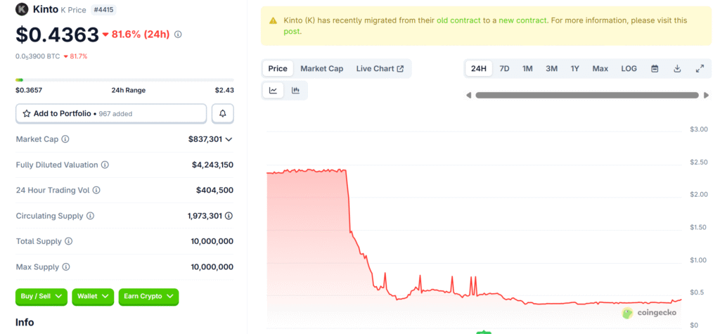 Due to the aftermath of the hack and of the ineffectual recovery, the value of the Kinto token ($K) has dropped to essentially nothing.