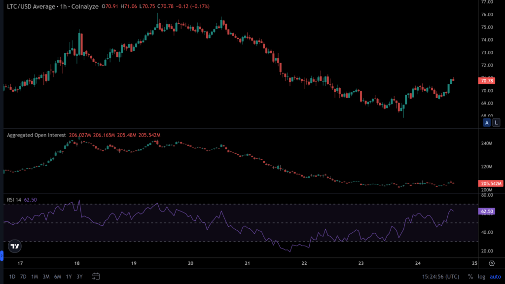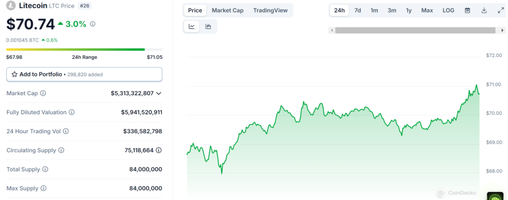 As of the latest market data, Litecoin is maintaining strong market presence with a price of $70.89 and a substantial 24-hour trading volume of $338,397,139.