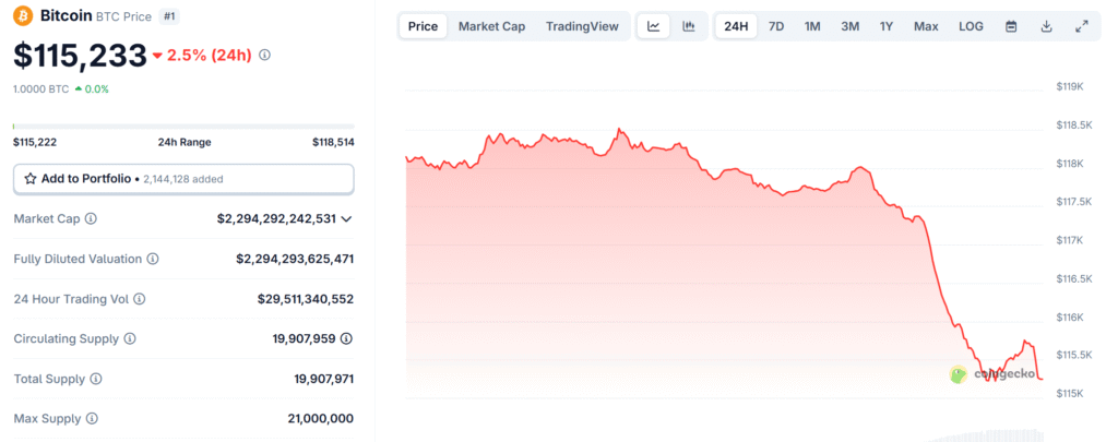 Currently, as at press time, Bitcoin’s price is trading at $115,215, which is down -2.45% in the last 24 hours, and down -5.37% in the previous week.
