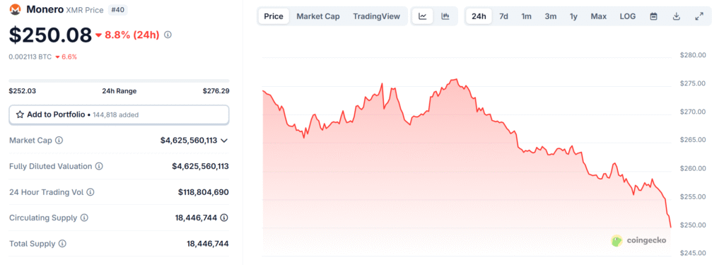 Currently, the price of Monero is trading at $249.52, reflecting a 9% price drop in the last 24 hours. Also, a 16% drop has been recorded in the past week.