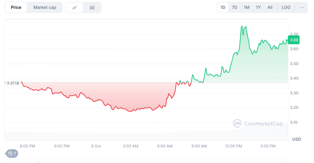 The token has seen price gains since the announcement. CAKE was trading at $3.64, up 8.1% on the day.