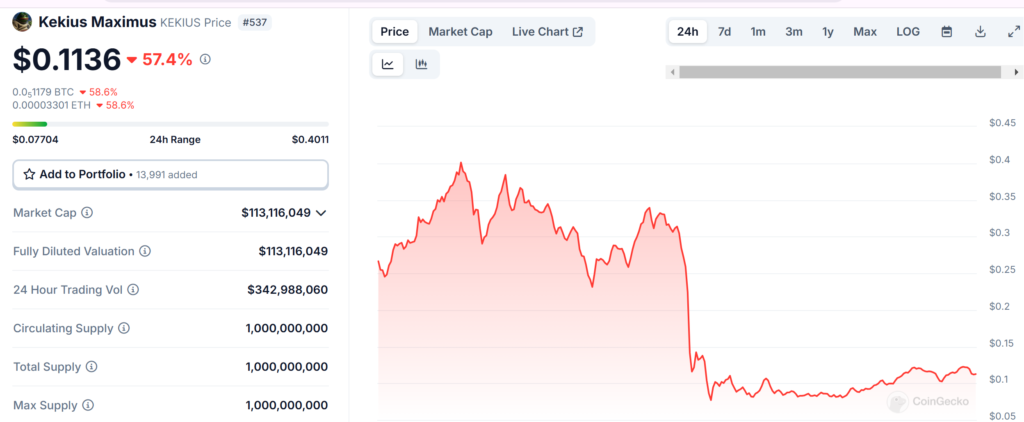 The token maintains a market capitalization of $113,116,049, with a circulating supply of 1 billion KEKIUS and a 24-hour trading volume of $342,988,060.