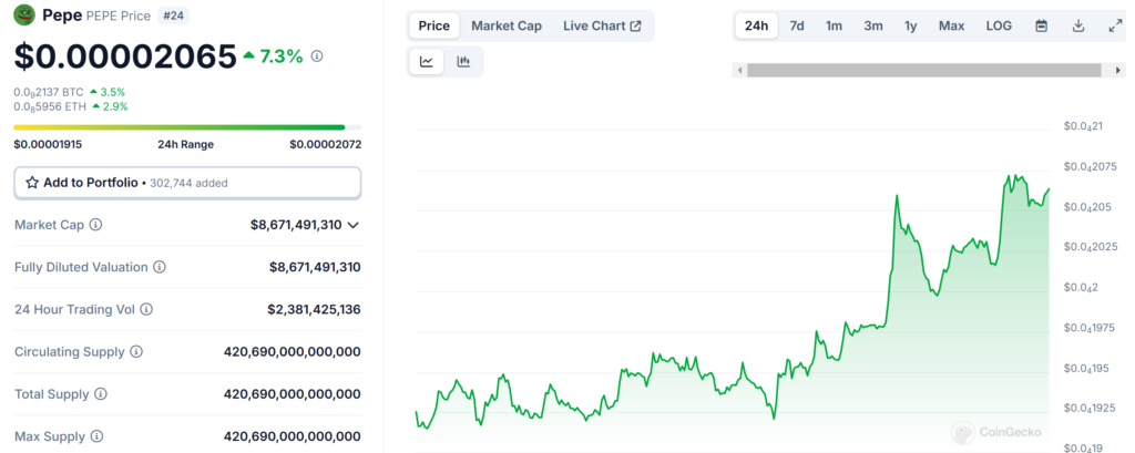 The price of Pepe (PEPE) is currently at $0.00002065 today with a 24-hour trading volume of $2,381,425,136 as of time of report. This represents a 7.25% price increase in the last 24 hours and an impressive 18.61% price increase in the past 7 days.