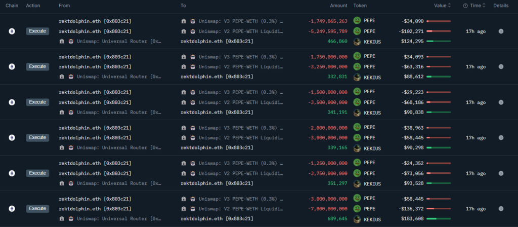 The trade has garnered considerable attention within the cryptocurrency community, particularly due to the substantial market value of $PEPE tokens being exchanged for $KEKIUS, a token with comparatively lower liquidity and market presence.