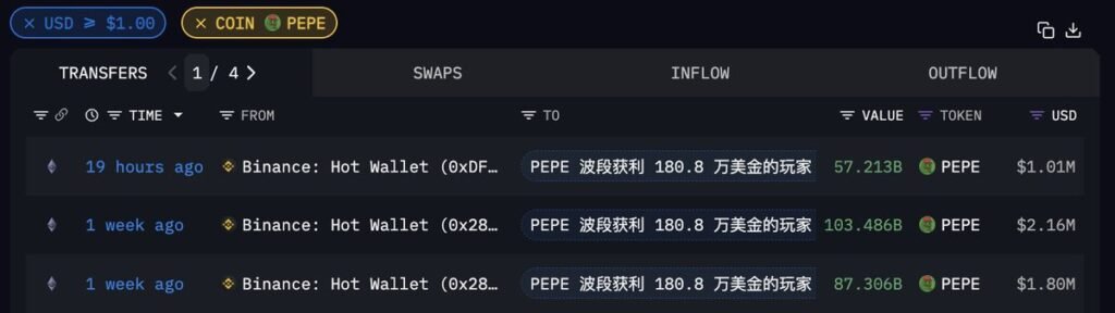 A notable transaction occurred 19 hours ago when they withdrew 57.2 billion PEPE tokens from Binance, suggesting a tactical decision to either consolidate holdings or reduce exposure to exchange-based risks.