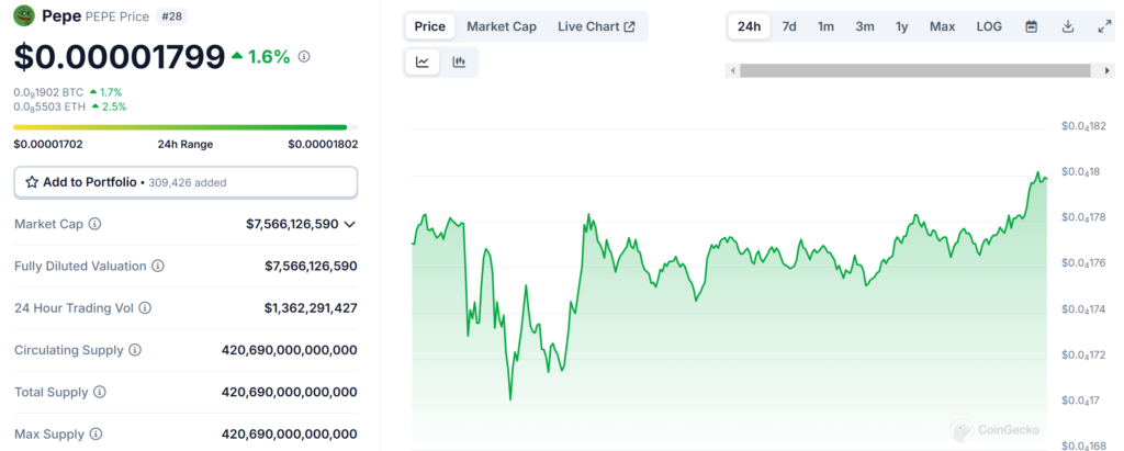 PEPE’s current market performance provides crucial context for understanding the trader’s position. The token is currently trading at $0.00001799, showing a modest 24-hour gain of 1.59% but a more concerning weekly decline of 14.32%.