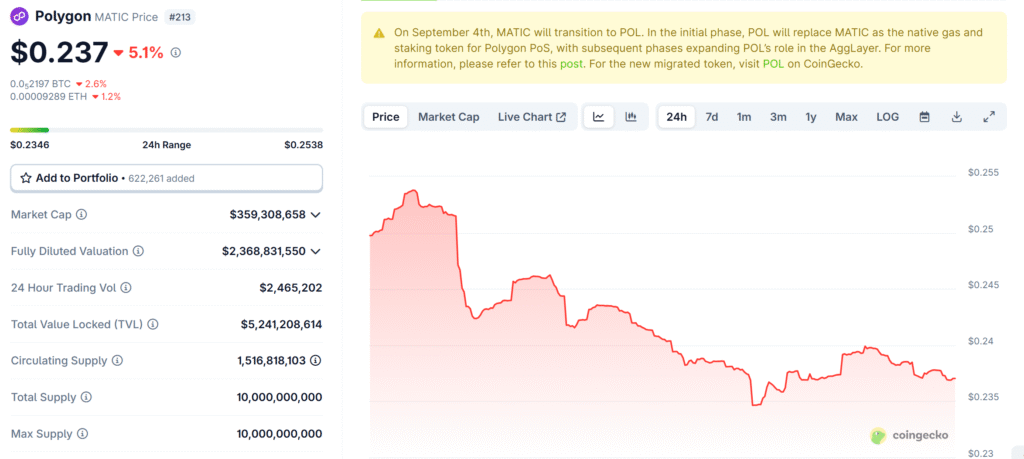Polygon’s native token, POL, has dropped by 5% in the past 24 hours and is currently trading just above $0.23.
