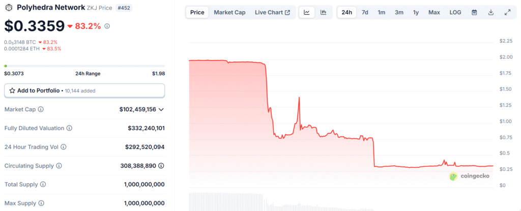 The price of Polyhedra Network’s native token, $ZKJ, plummeted by over 83% in just 24 hours, sparking panic across the crypto market.