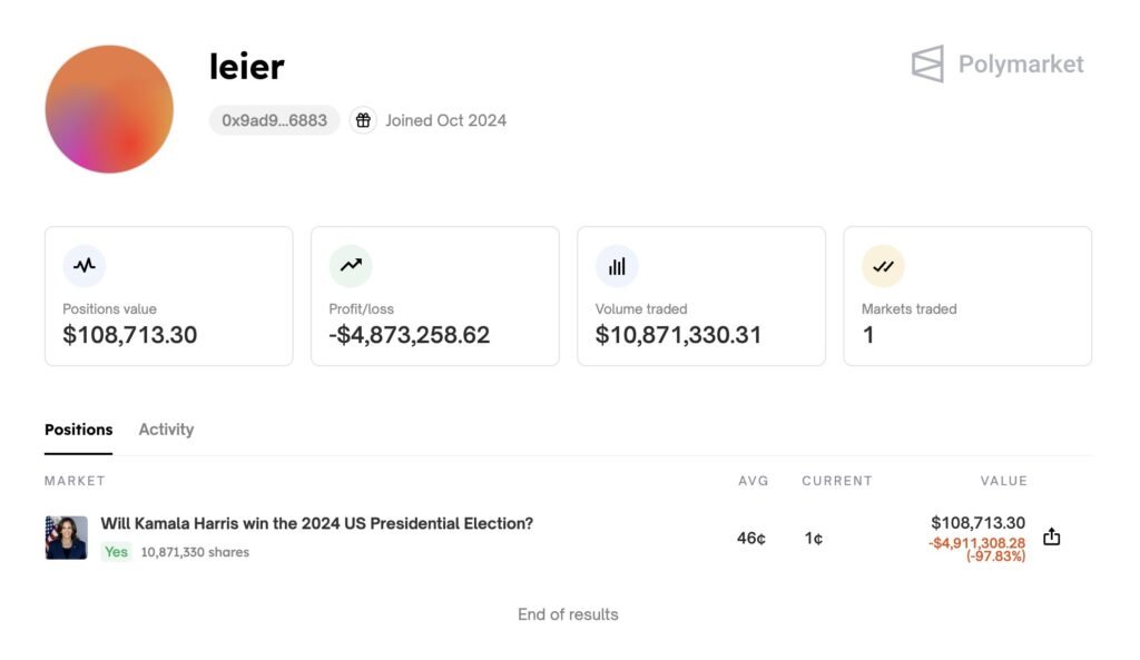 The most notable was a trader betting on Harris (address: 0x9ad9…6883), who suffered a devastating loss of approximately $4.9 million, representing a -97.83% decline on their initial position of 10.87 million shares.