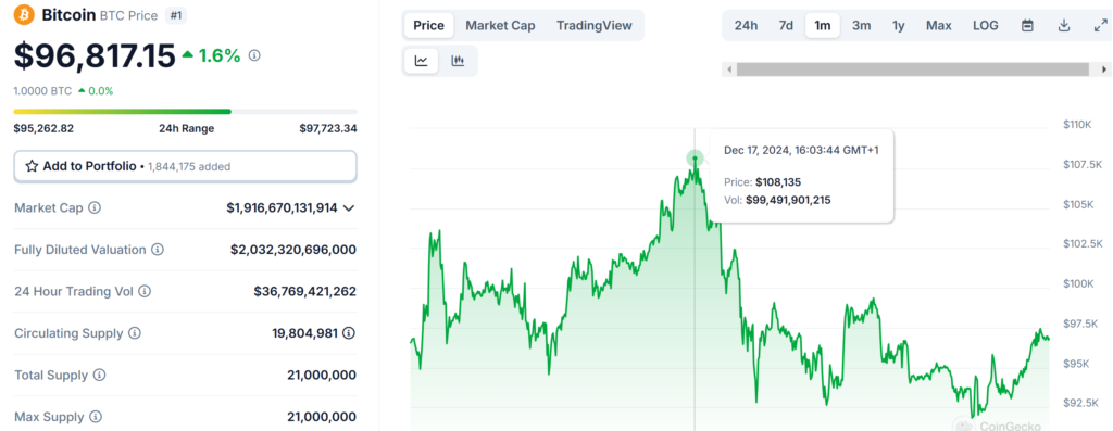 As of the latest market data, Bitcoin is trading at $96,817.15, showing positive short-term momentum with a 1.63% increase in 24 hours and a 0.70% rise over the past week.