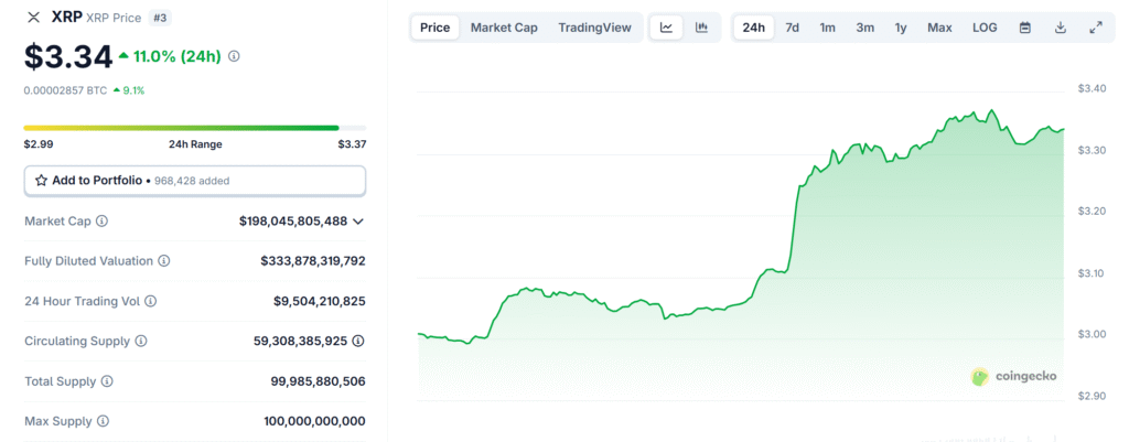 News of the settlement has helped propel XRP’s bullish movement to $3.34, an 11.14% increase over the past 24 hours and a 13.14% increase over the past week.