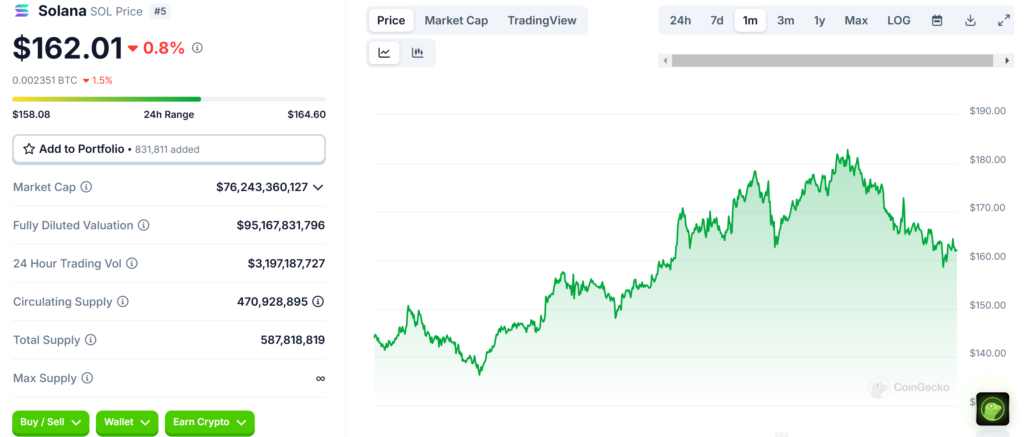 Solana’s current market position shows both short-term fluctuations and long-term strength. The token is trading at $162.01, with a substantial 24-hour trading volume of $3.19 billion.
