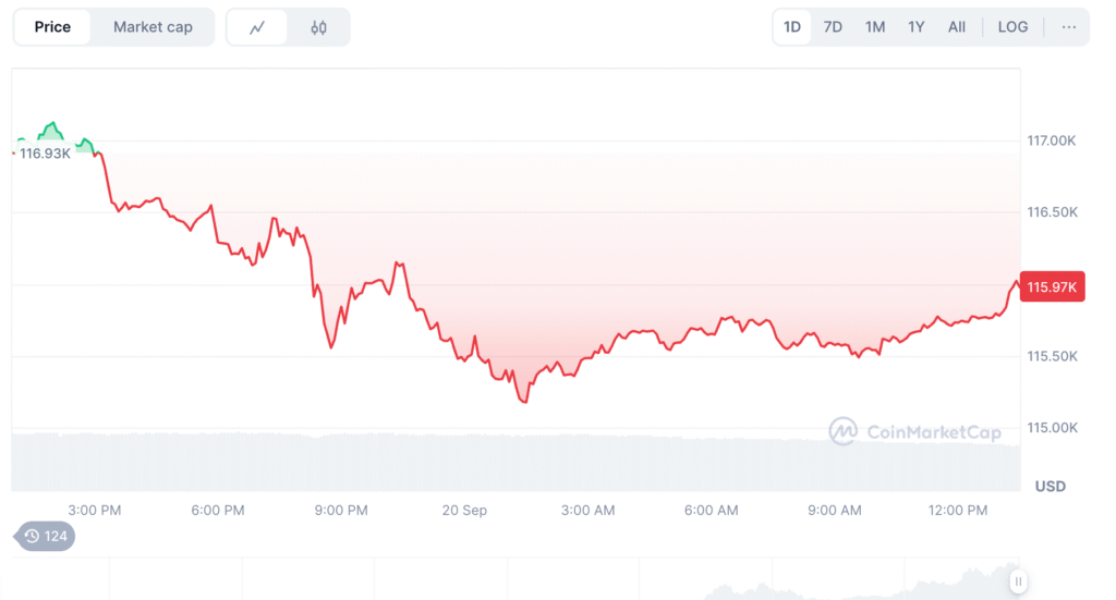 Bitcoin’s run to $124,100 in mid-August surprised many traders. Since then, the price has pulled back. At the time of writing, the coin trades around $115,760. Some analysts say the Fed’s expected rate cuts helped lift markets, but others think the cuts were already priced in.