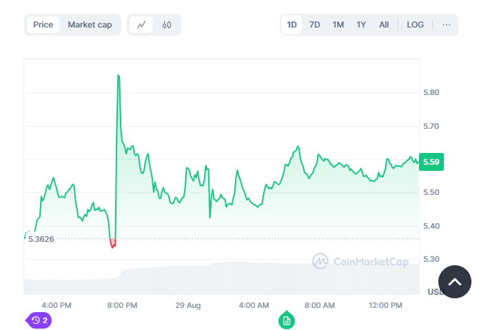 As of today, the token has regained some bullish momentum, climbing 5% in the past 24 hours to trade at $5.60. However, the token remains down by more than 13% over the past week.