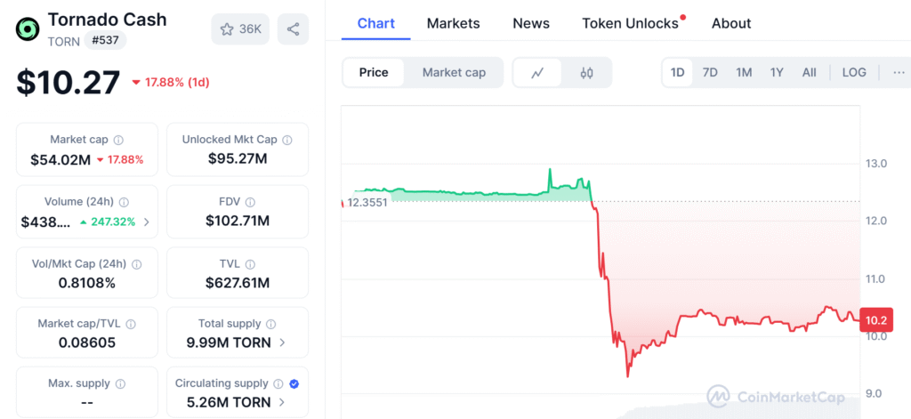 Storm’s conviction saw the marketplace react immediately and harshly. The $TORN token decreased in value by 17.88% in the past 24 hours, dropping to $10.27 at reporting.