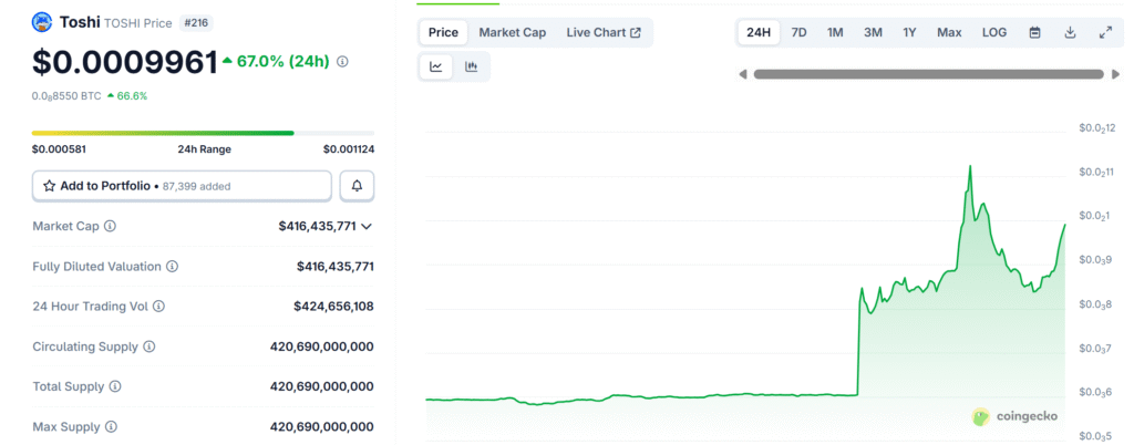 As of the current date, TOSHI is trading at $0.0009724 with a trading volume of $424.6 million in the last 24 hours, representing a gain of 64.15% in the last 24 hours and a gain of 71.11% in the previous week.