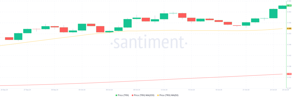 Other market data predicts that TRON’s 200-day SMA will increase over the course of the upcoming month, reaching $0.138164 by November 24. During the same time, TRON’s short-term 50-Day SMA is predicted to reach $0.151351.