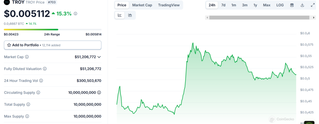 TROY token has demonstrated remarkable market momentum, recording a substantial price increase to $0.005112, accompanied by an impressive 24-hour trading volume of $300,503,670.