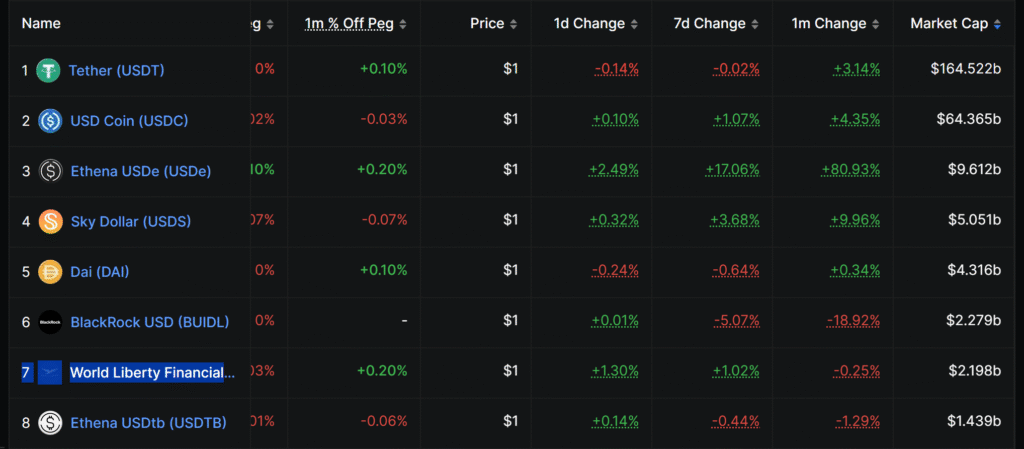 According to DefiLlama, USD1 currently ranks 7th among all stablecoins by market capitalization, sitting at $2.198 billion, while Tether (USDT) remains the leader with over $164 billion.