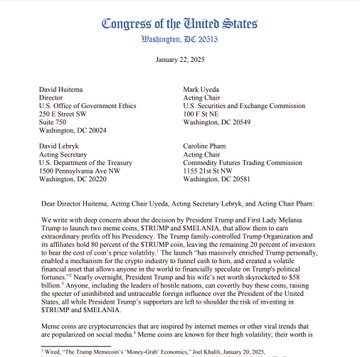 “We write with deep concern about the decision by President Trump and First Lady Melania Trump to launch two meme coins, $TRUMP and $MELANIA, that allow them to earn extraordinary profits off his presidency,” the lawmakers stated.
