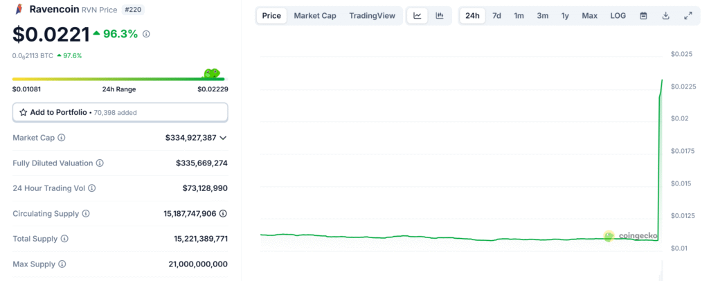 Trading volume has exploded to $73.1 million within 24 hours, and Ravencoin’s total market cap now exceeds $334.9 million.