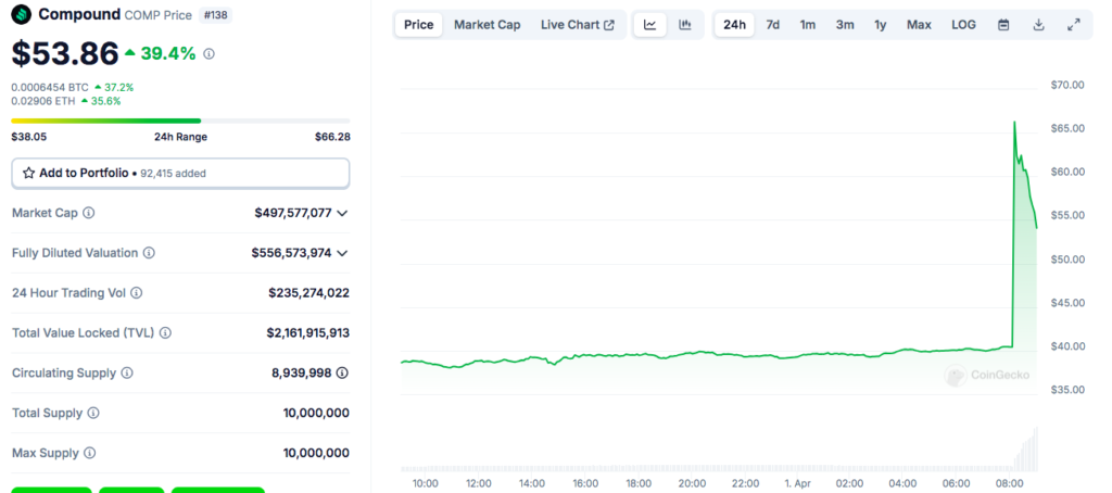 Following the announcement, the COMP token has experienced an impressive 39.43% increase in price, reaching $53.86 in just 24 hours.