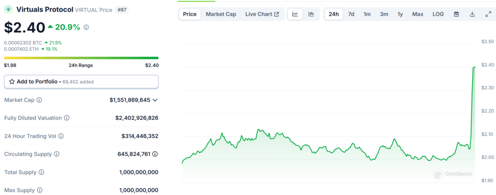 Virtual Protocol has achieved a significant milestone with its listing on Upbit, South Korea’s largest cryptocurrency exchange, triggering an immediate 17.76% surge in its native token VIRTUAL’s price to $2.34.